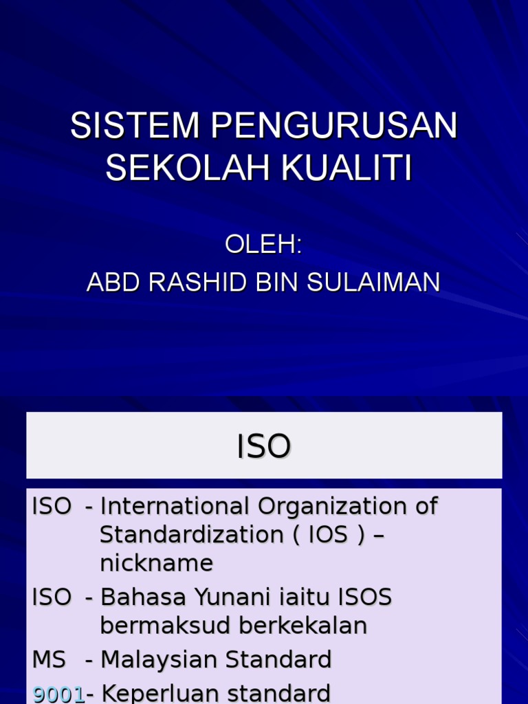 Title slide of sistem pengurusan sekolah kualiti. Manual kualiti ini disediakan untuk memenuhi matlamat dan objektif p dan p di sekolah , selaras dengan kehendak dan ke arah keperluan ms iso 9001:2008. Talian kecemasan (waris) yang boleh dihubungi dengan segera. Digabungkan menjadi sistem pengurusan kualiti pengurusan prasiswazah dan siswazah [spkppps: Keperluan kualiti pkpa bil 1/1992 :